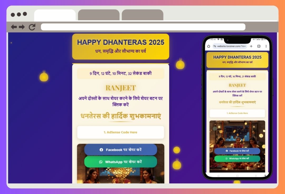 Create a stunning Dhanteras greeting website instantly! 💰✨ Personalized name wishes, animated gold sparkles, floating diya & coins 🪔🪙, countdown timer ⏳, images, quotes & audio integration 🎵. Works on Blogger, WordPress & any hosting platform! 🌐